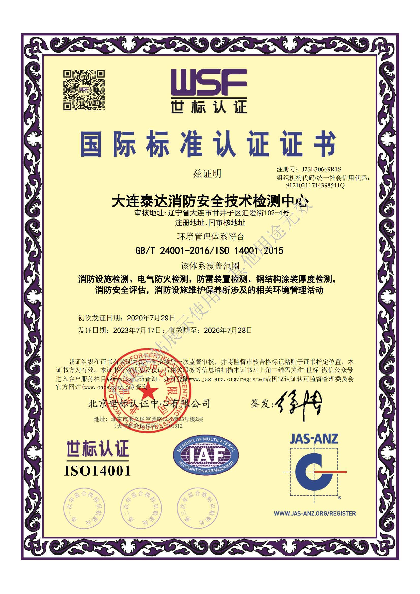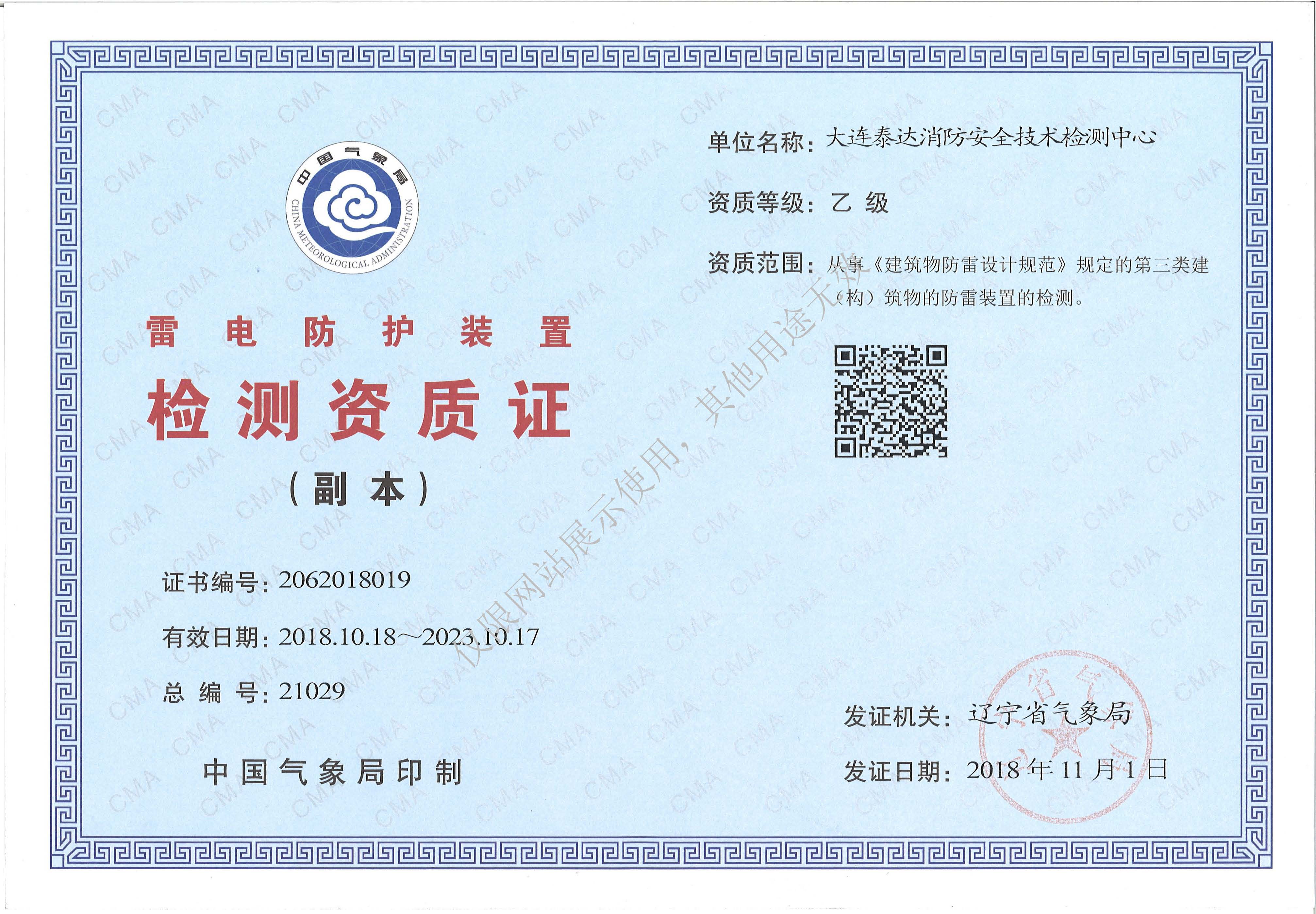 · 是經“社會消防技術服務信息系統”備案并公示的消防技術服務機構,已取得中國氣象局頒發(fā)的雷電防護裝置檢測資質證書、遼寧省質量技術監(jiān)督局審核批準的檢驗檢測機構資質認定證書(CMA)及包括消防檢測、電氣檢測、雷電防護裝置檢測、防火涂層厚度檢測等在內的200余項檢驗檢測能力,取得大連市應急管理局頒發(fā)的安全生產標準化證書,獲得質量管理體系、環(huán)境管理體系、職業健康安全管理體系認證證書,是經備案的高新技術企業,可獨立出具具有證明作用的檢測報告。